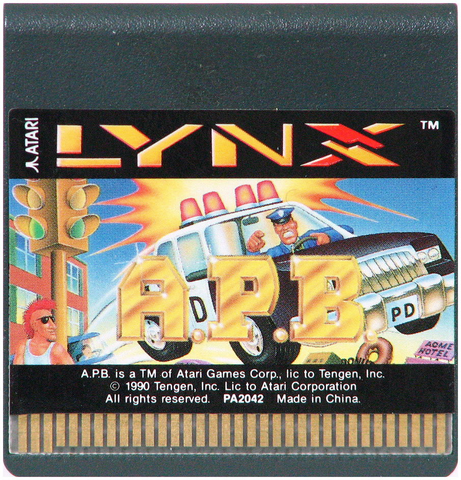 A.P.B., an abbreviation for 'All Points Bulletin,' is an arcade game that was ported to the Atari Lynx in 1991. Originally developed by Atari Games, it is a comedic police driving game that puts players in the shoes of Officer Bob, whose job is to patrol the streets and arrest lawbreakers. Players must meet daily arrest quotas while avoiding false arrests to progress. Set in an open-world environment, the game combines elements of action with driving, requiring both quick reflexes and sharp eyes. A.P.B. is known for its unique art style, humor, and challenging gameplay that contributed to its recognition in the genre of police-themed arcade games of its era.