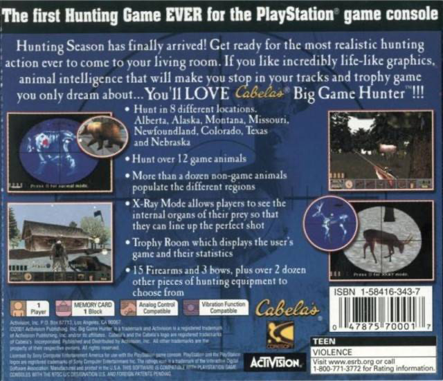 Cabela's Big Game Hunter: Ultimate Challenge for Sony PS1 is a hunting simulation video game offering players an immersive outdoor experience. As part of the popular Cabela's franchise, it allows players to track and hunt various big game animals across multiple environments. Armed with a range of firearms and hunting gear, players must employ stealth, strategy, and sharpshooting skills to successfully bag their trophies. The game falls within the sports and simulation genres, with a focus on realistic hunting scenarios and wildlife behaviors.