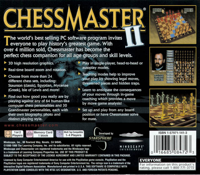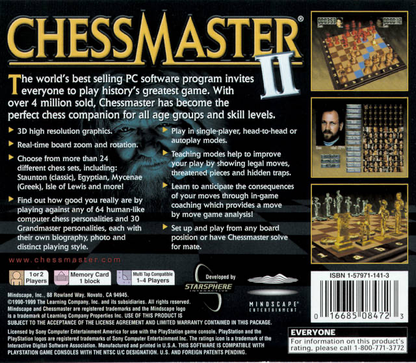 Chessmaster II for the Sony PlayStation 1 is a strategy-simulation game known for its comprehensive chess training and play experience. It's a digital version of the classic board game, designed to cater to players of all skill levels, from novices to grandmasters. With an AI that adapts to your playing strength, a vast library of openings, and instructional modes, Chessmaster II offers an in-depth learning environment. It features various 2D and 3D chess sets, along with multiplayer options for competitive play. The game's rich analysis tools help players refine their chess tactics and strategy.