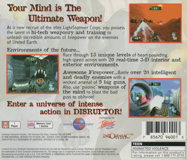 Disruptor is a first-person shooter (FPS) for the Sony PlayStation 1, developed by Insomniac Games and released in 1996. The game blends sci-fi elements and fast-paced action as players take on the role of a futuristic soldier equipped with powerful energy weapons and psionic abilities. Players navigate through a variety of levels, battling alien creatures and enemy soldiers, while unraveling a narrative that delves into themes of military conflict and bio-engineered enhancements. Its combination of shooting mechanics and brainwave-powered attacks distinguishes Disruptor within the genre.