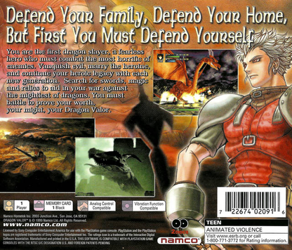Dragon Valor is an action-adventure role-playing game (RPG) for the Sony PlayStation 1. Released in 1999, it combines hack-and-slash gameplay with platforming and light puzzle-solving elements. Players assume the role of multiple generations of a family lineage of warriors, known as Dragon Valors, each destined to confront and defeat malevolent dragons. The game features a branching storyline with multiple paths and endings, determined by the player's choices. Combat is real-time, with a focus on melee weapon skills and magic spells to defeat a variety of mythical enemies.