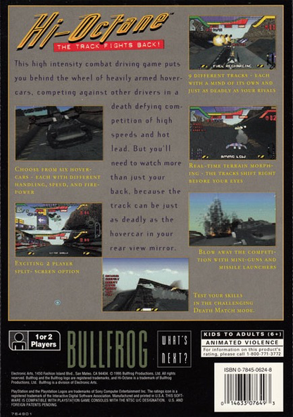 Hi-Octane is a fast-paced futuristic racing game developed by Bullfrog Productions for the Sony PlayStation 1. Released in the mid-90s, it belongs to the racing genre and features a sci-fi setting with high-speed hovercraft vehicles. Players race across various terrains and tracks, each offering unique challenges, and can compete against AI opponents or other players. The longbox packaging refers to the game's original tall plastic case. With an arsenal of weapons to take out competitors and a focus on breakneck speeds, Hi-Octane delivers an adrenaline-fueled racing experience.
