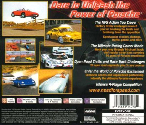 Need for Speed: Porsche Unleashed for the Sony PlayStation 1 is a racing game that exclusively features Porsche vehicles throughout the automaker's history. Released in 2000, the game is part of the popular Need for Speed series and focuses on delivering an authentic Porsche experience with a variety of models from classic to contemporary. The game offers different modes, including a career mode where players progress through the history of Porsche, with realistic driving dynamics and car customization. Its genre is arcade racing with simulation elements, aimed at car enthusiasts and gamers alike.