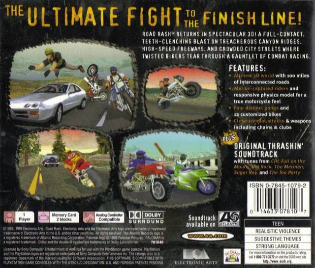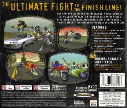 Road Rash 3D - Greatest Hits for the Sony PS1 is an action-packed, combat racing game that thrusts players into high-speed motorcycle races with an added twist: hand-to-hand combat. Sporting updated 3D graphics from its 16-bit predecessors, this title allows players to battle against tough opponents while navigating through traffic, taking risky turns, and fighting to the finish line. Players earn money from races to buy new bikes and upgrades. Its unique fusion of racing thrills and brawling mechanics make it a distinguished title in the racing genre of its time.