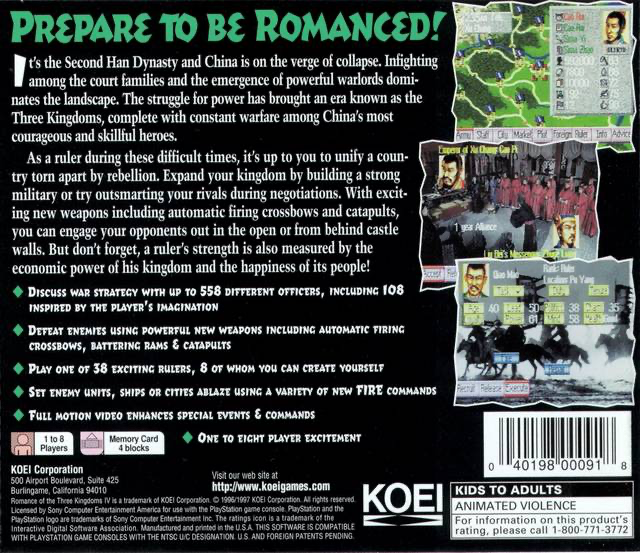 Romance of the Three Kingdoms IV: Wall of Fire is a turn-based strategy game for the Sony PlayStation 1. As an installment in the long-standing historical simulation series by KOEI, players assume the role of a warlord during China's Three Kingdoms era (220-280 AD). The game combines deep strategic gameplay with role-playing elements, tasking players with managing resources, recruiting and commanding armies, and engaging in diplomatic or military conquests to unite China under their banner. With a mix of historical figures and events, the game offers an immersive experience in ancient Chinese history.