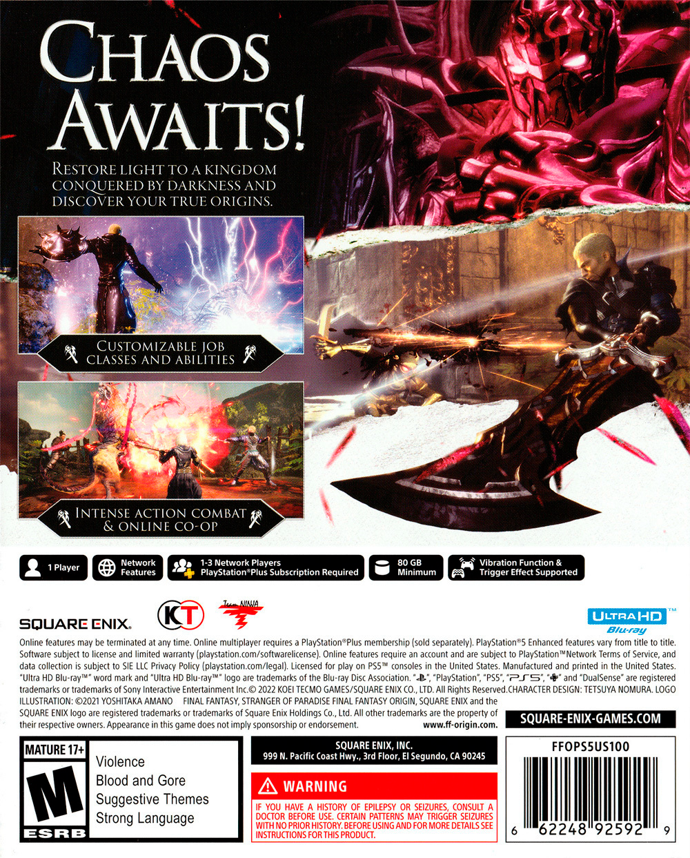 Stranger of Paradise: Final Fantasy Origin is an action RPG developed by Team Ninja and published by Square Enix. Released in 2022 for the PS5, it offers a darker and more mature reinterpretation of the Final Fantasy series. Players control Jack, who is on a quest to defeat Chaos. The game combines real-time combat with strategy and offers a unique job system, allowing customization of characters to match different playstyles. It pays homage to the franchise's roots while delivering a new narrative.