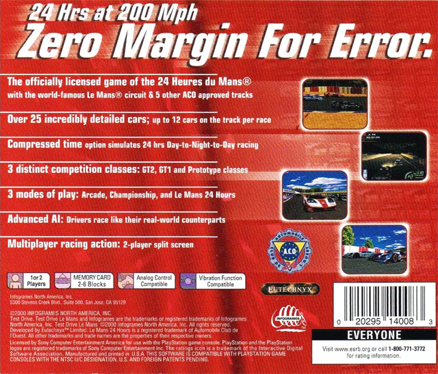 Test Drive Le Mans for the Sony PlayStation 1 is an exhilarating racing game that puts players behind the wheel of high-speed endurance race cars. Emulating the prestigious 24 Hours of Le Mans event, the game features authentic tracks and vehicles from the famous race. As a part of the Test Drive series, this title emphasizes realism and performance, with meticulous attention to vehicle handling and track details. The game falls into the simulation and arcade racing genre, appealing both to fans of realistic racing experiences and those who enjoy quick, action-packed driving challenges.