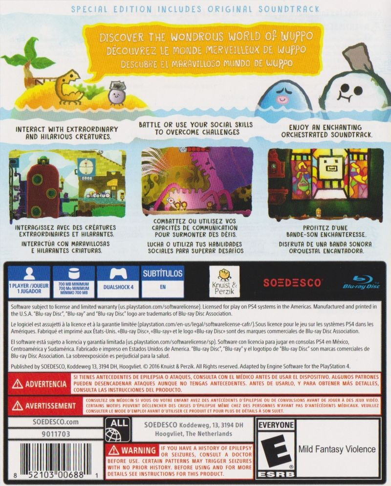 Wuppo - Special Edition is a whimsical and colorful action-adventure game released for the PlayStation 4. The game, centered around a charming and round creature called Wum, invites players on a delightful journey through a diverse and hand-drawn world. It combines elements of platforming, puzzles, and exploration, presenting players with a unique and lighthearted experience. As players dive into the world of Wuppo, they'll discover a rich history, meet quirky characters, and face off against numerous challenges. Originally released on PC in 2016, the PS4 Special Edition includes additional content and improvements.
