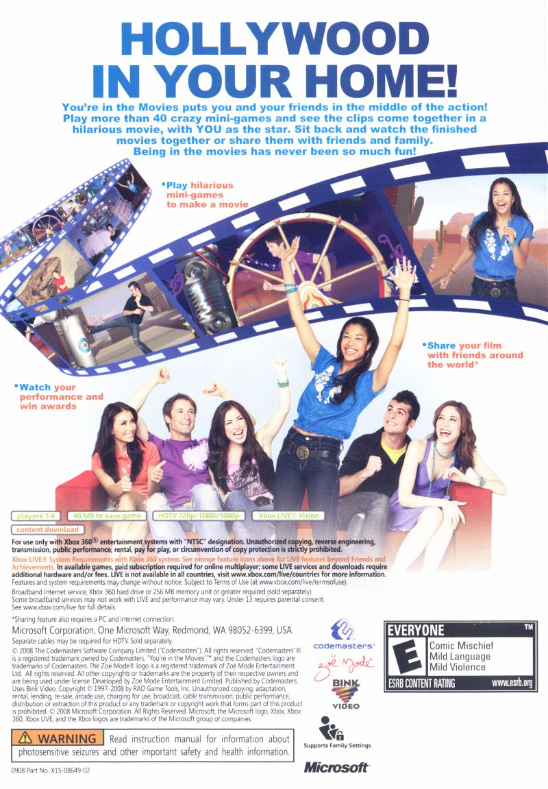 You're In The Movies is a party simulation game released for Microsoft Xbox 360. As a family-friendly title, it falls in the casual gaming genre and utilizes the Xbox Live Vision Camera to place players within a variety of quirky, B-movie-style film scenarios. Players perform in mini-games and act out scenes, which the game then stitches together to create a full, albeit humorous, movie featuring them as the stars. The game encourages group participation and is designed as a social experience, making it a distinctive choice for parties and family gatherings.